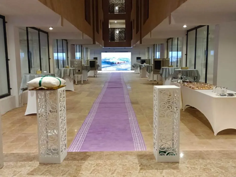 كما تم تجهيز مدخل المبنى بشاشة عرض كبيرة، ومكيفات هواء لتوفير راحة الضيوف، إلى جانب سجاد فخم وشريط ومقص الافتتاح لإضفاء الطابع الرسمي على الحدث.