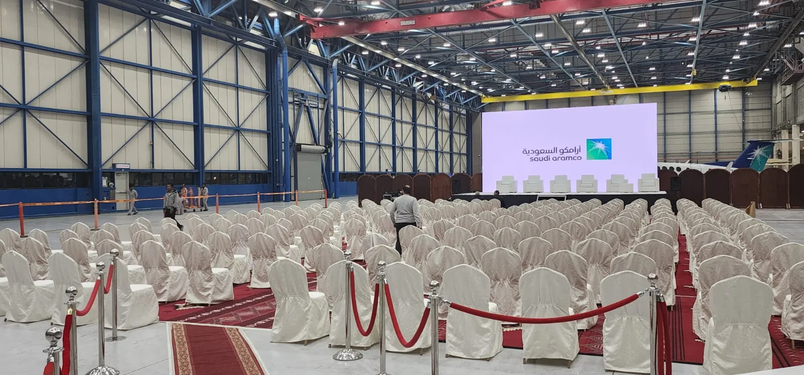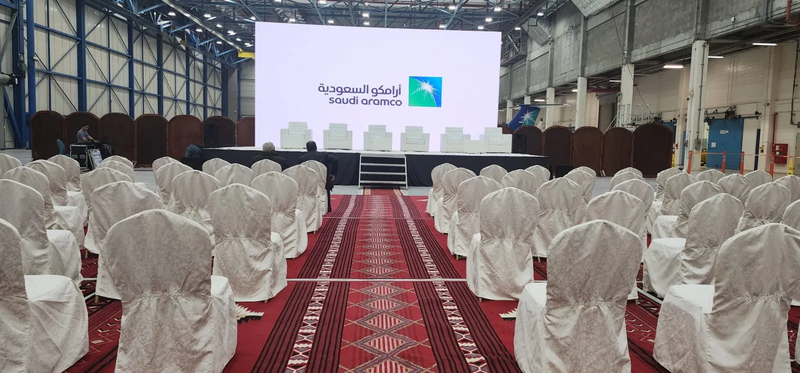كما تم فرش السجاد الفاخر ووضع الحواجز المذهبة بأسلوب أنيق، ما أضفى على الفعالية جوًا راقيًا يعكس أعلى مستويات الخبرة المهنية في التنفيذ.