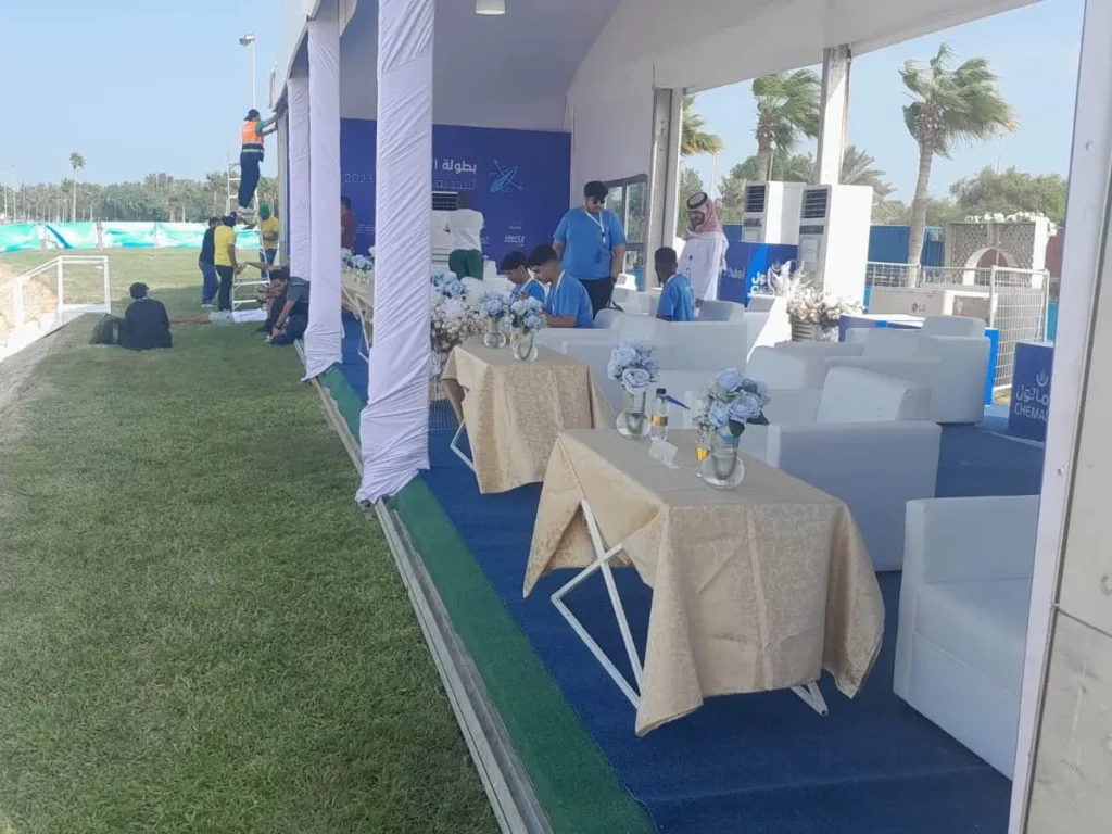 شمل الحدث تجهيز خيام فاخرة، ومقاعد VIP، وشاشة عرض عملاقة، إضافة إلى سجاد فاخر بتفاصيل راقية تعكس مستوى الخبرة المهنية وجودة التنفيذ.